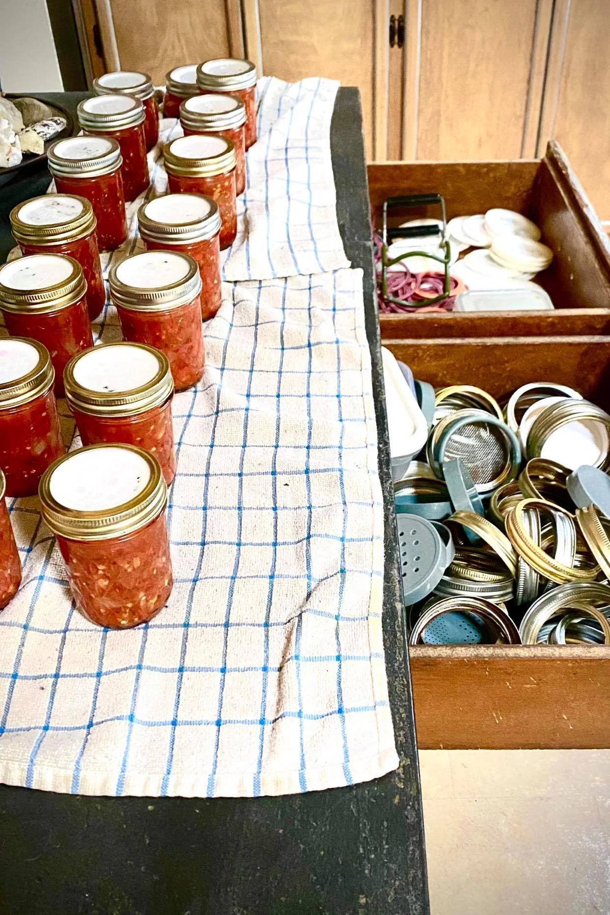I store my lids and rings immediately below where I cool my jars.
