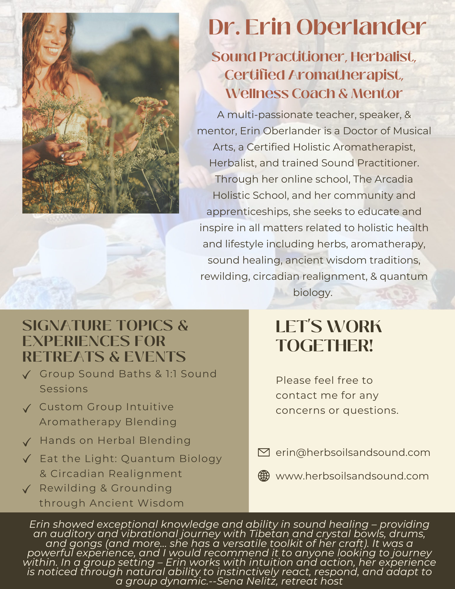 Erin showed exceptional knowledge and ability in sound healing – providing an auditory and vibrational journey with Tibetan and crystal bowls, drums, and gongs (and more... she has a versatile toolkit of her craft). It was a powerful experience, and I would recommend it to anyone looking to journey within. In a group setting – Erin works with intuition and action, her experience is noticed through natural ability to instinctively react, respond, and adapt to a group dynamic. --Sena Nelitz
